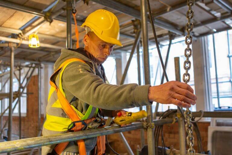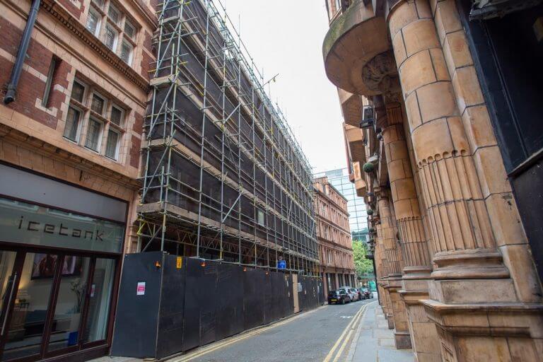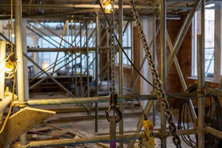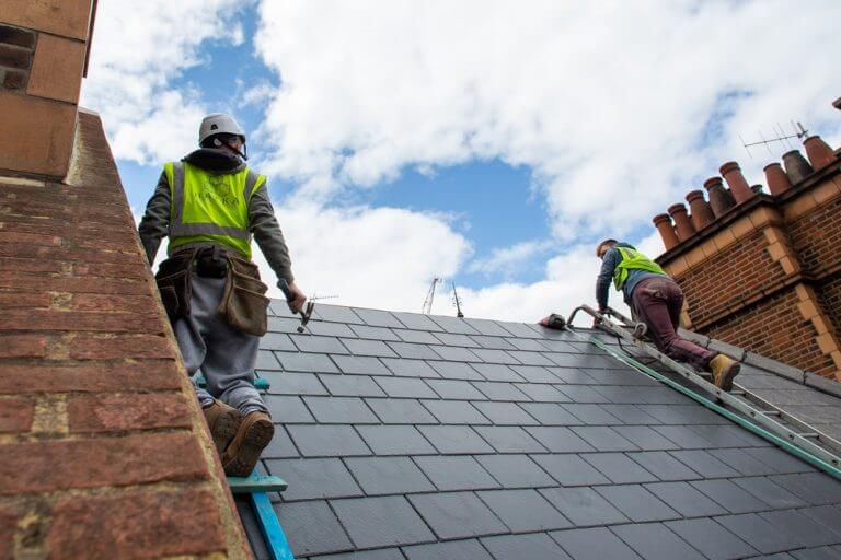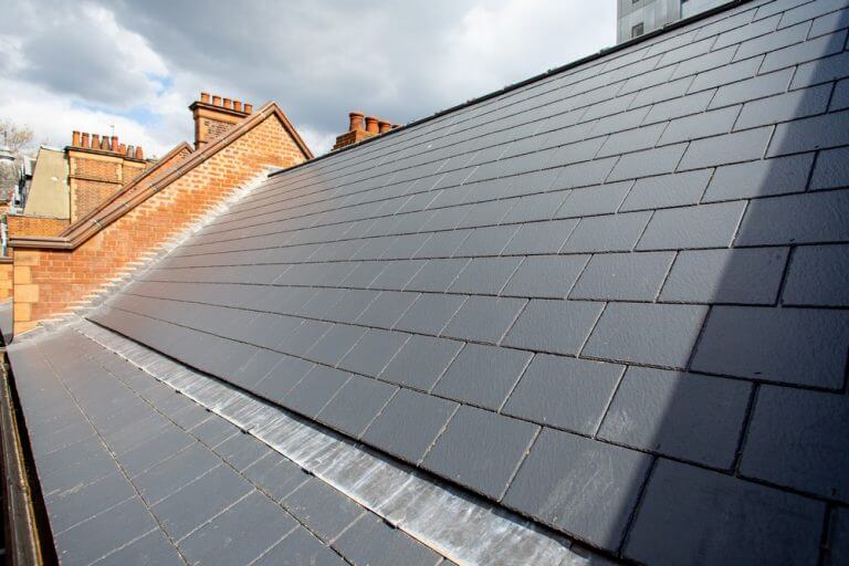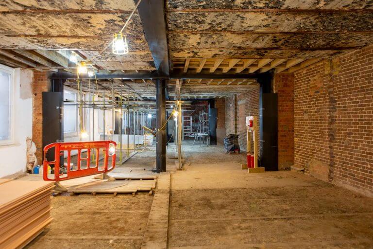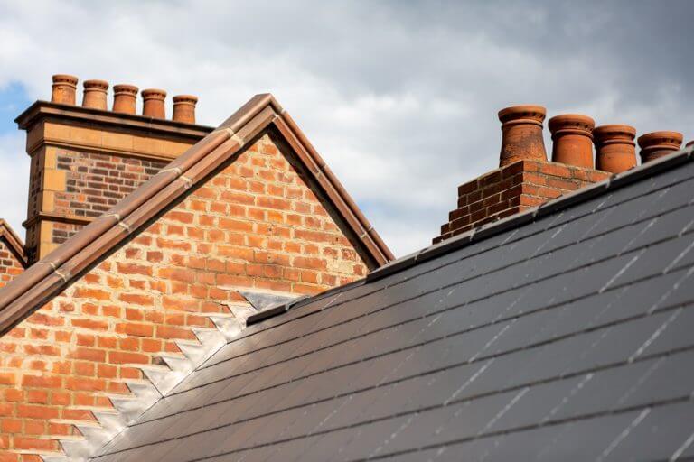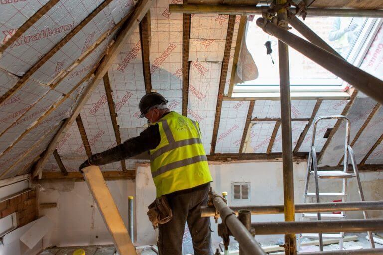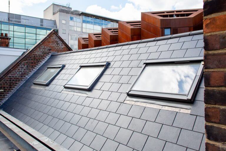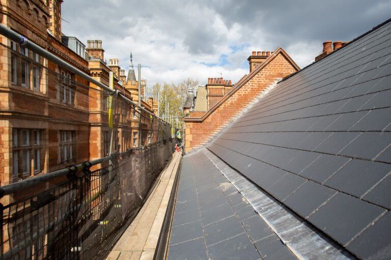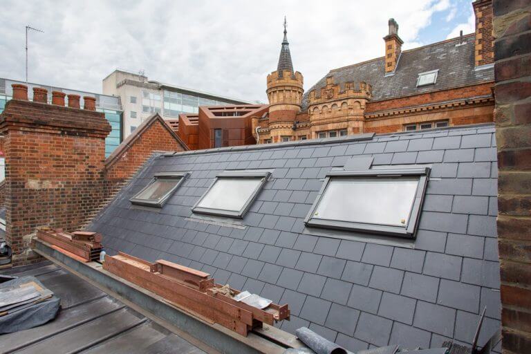 This project presented several technical and logistical challenges that we were able to address through thorough planning and coordination. The vaulted ceilings within the new office building required us to complete a roof strengthening programme, doubling up the rafters to account for where cross timbers had been removed within the original truss roof structure. There was also no access to the rear of the building, meaning that a scaffold was only permitted on the building’s façade. This meant that project planning had to accommodate the need to bring all materials up to the roof via this less direct route. Finally, the Covid-19 pandemic disrupted the initial project timings that had been agreed with the client. This meant that, although the work was meant to have been completed during the summer, it became a winter project instead. Where poor weather and snow prevented us from working on the roof exterior, we remained flexible and prioritised aspects such as timberwork instead.